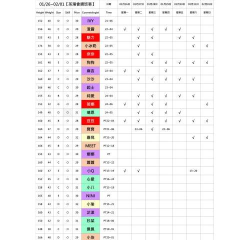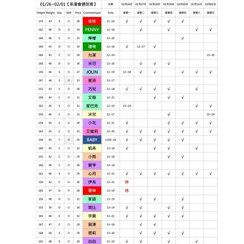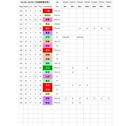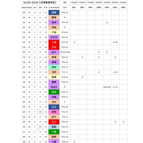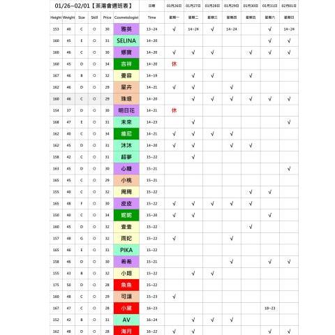 班表上顏色即為價格區分